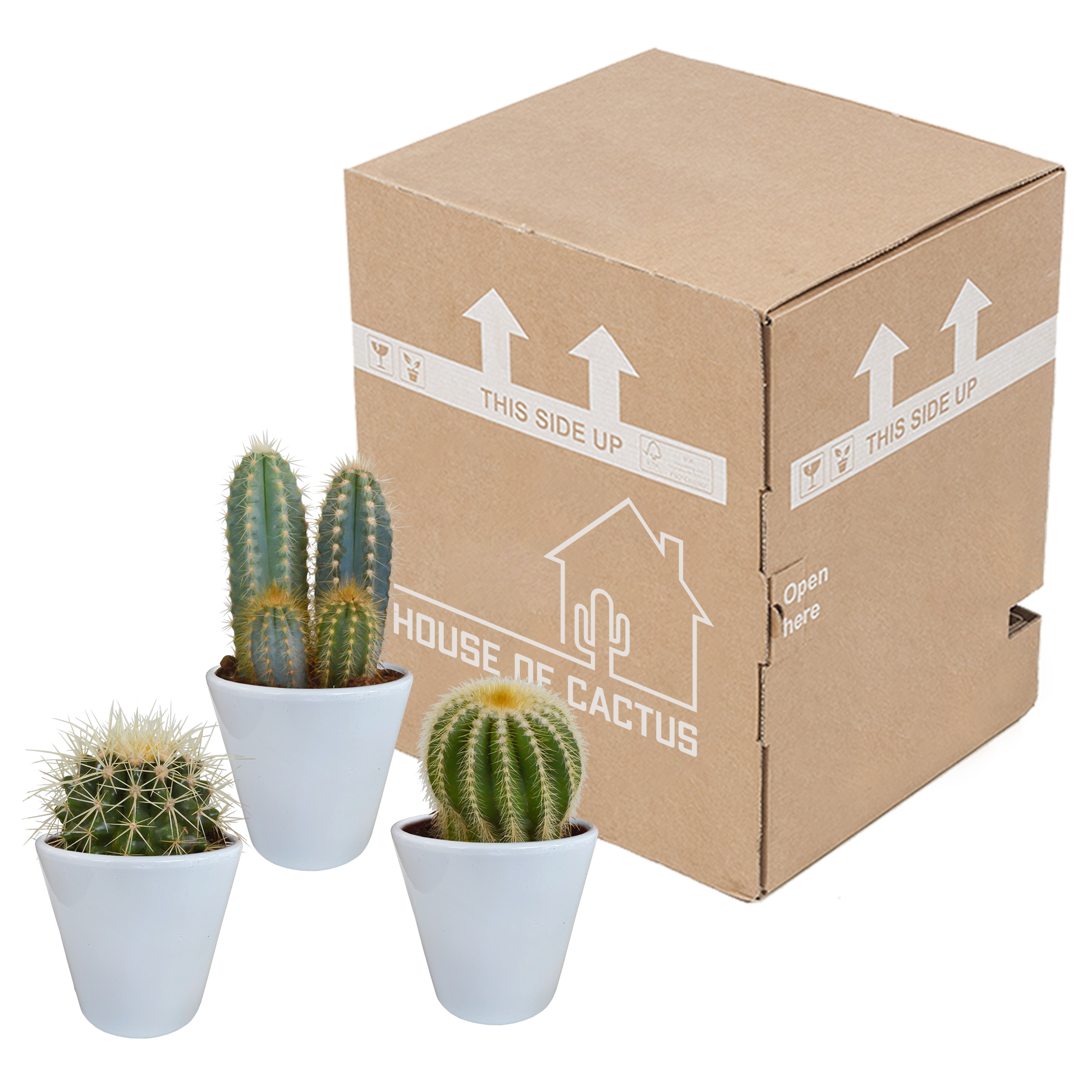 Deze set van drie cactussen combineert verschillende vormen, tinten en structuren — van ronde bolvormen tot ranke zuilen, met stekels variërend van zacht tot robuust. Elk exemplaar heeft een eigen karakter, waardoor de set een speels maar stijlvol geheel vormt. Geleverd in moderne witte potten, past deze mix moeiteloos in elk interieur — van minimalistisch tot botanisch. Perfect als subtiel accent op tafel, vensterbank of bureau.