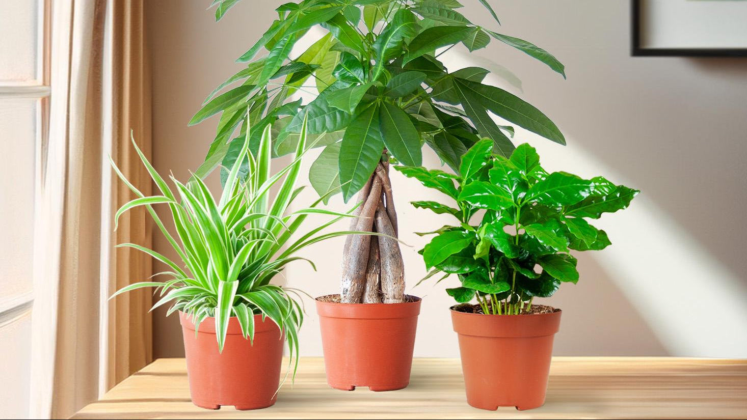 De Pachira aquatica (35 cm, Ø12 cm pot) heeft gevlochten stammen en glanzende bladeren. De Chlorophytum comosum (25 cm, Ø12 cm pot) toont elegante gestreepte bladeren met hangende uitlopers. De Coffea arabica (20 cm, Ø12 cm pot) biedt donkergroene glanzende bladeren. Samen creëren ze een gevarieerde groene oase met verschillende texturen en bladkleuren.