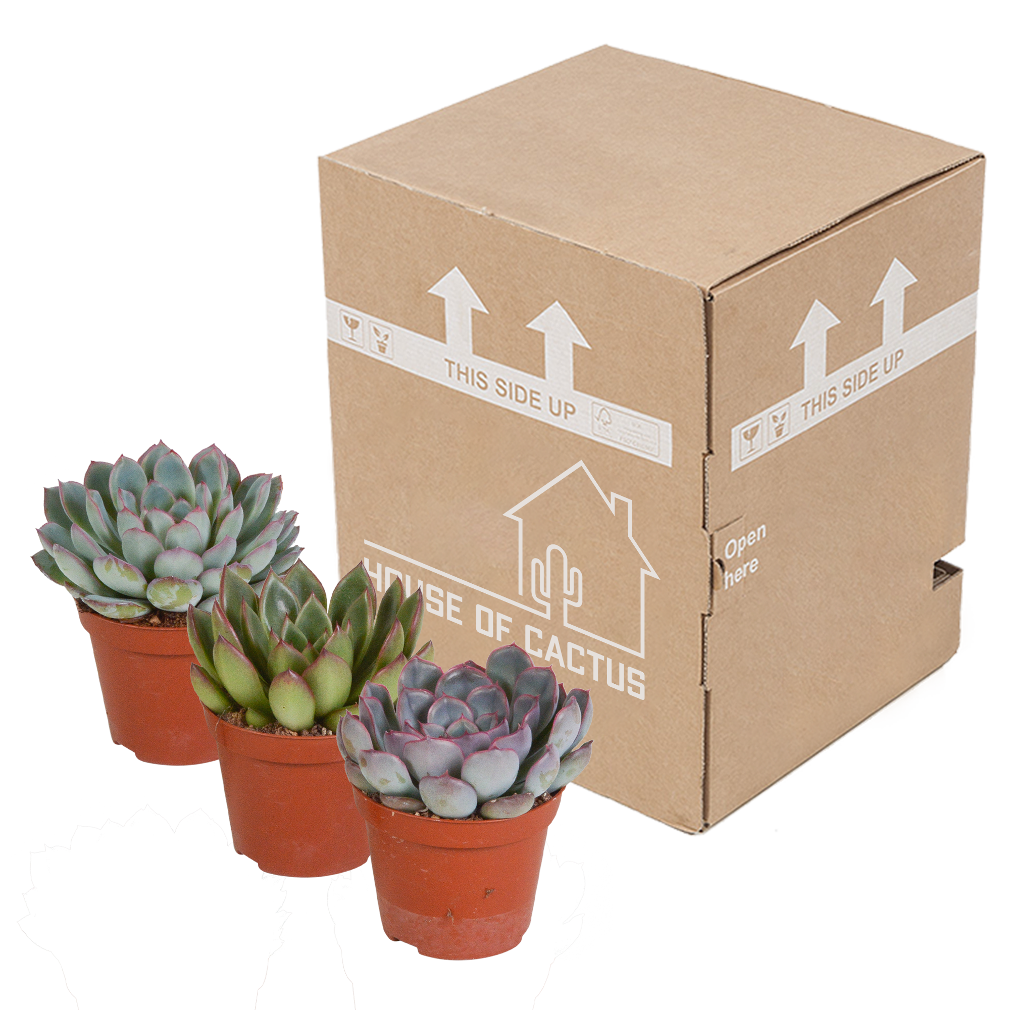 De Echeveria is een authentieke vetplant uit de semi-woestijngebieden van Mexico en Centraal-Amerika. Vernoemd naar de Mexicaanse botanisch kunstenaar Atanasio Echeverría y Godoy. Deze mix bevat 3 verschillende Echeveria's met unieke kleurschakeringen van groen-blauw tot roze-paars, geleverd in een moderne witte pot.