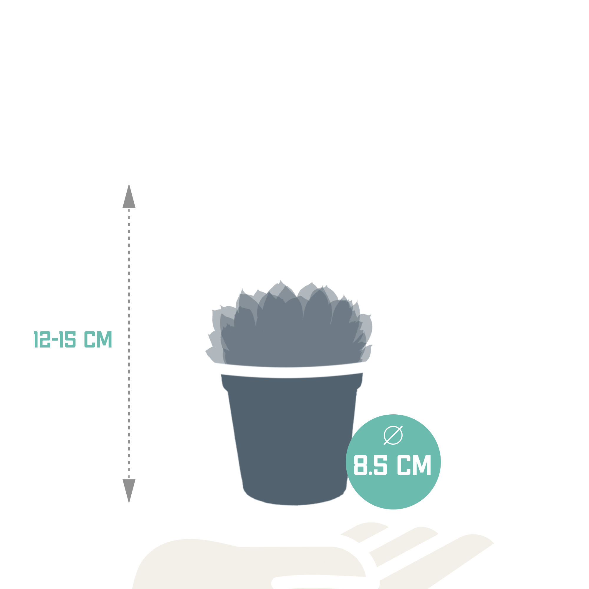 Kenmerkt zich door bloemvormige rozetten van vlezige bladeren met beschermende waslaag en subtiele poederachtige glans. Set van 3 Echeveria's (8,5 cm) in stijlvolle witte pot. Perfect voor vensterbank, bureau of vetplantenarrangement. Past in elk modern interieur. Kan bloemen produceren onder juiste omstandigheden.