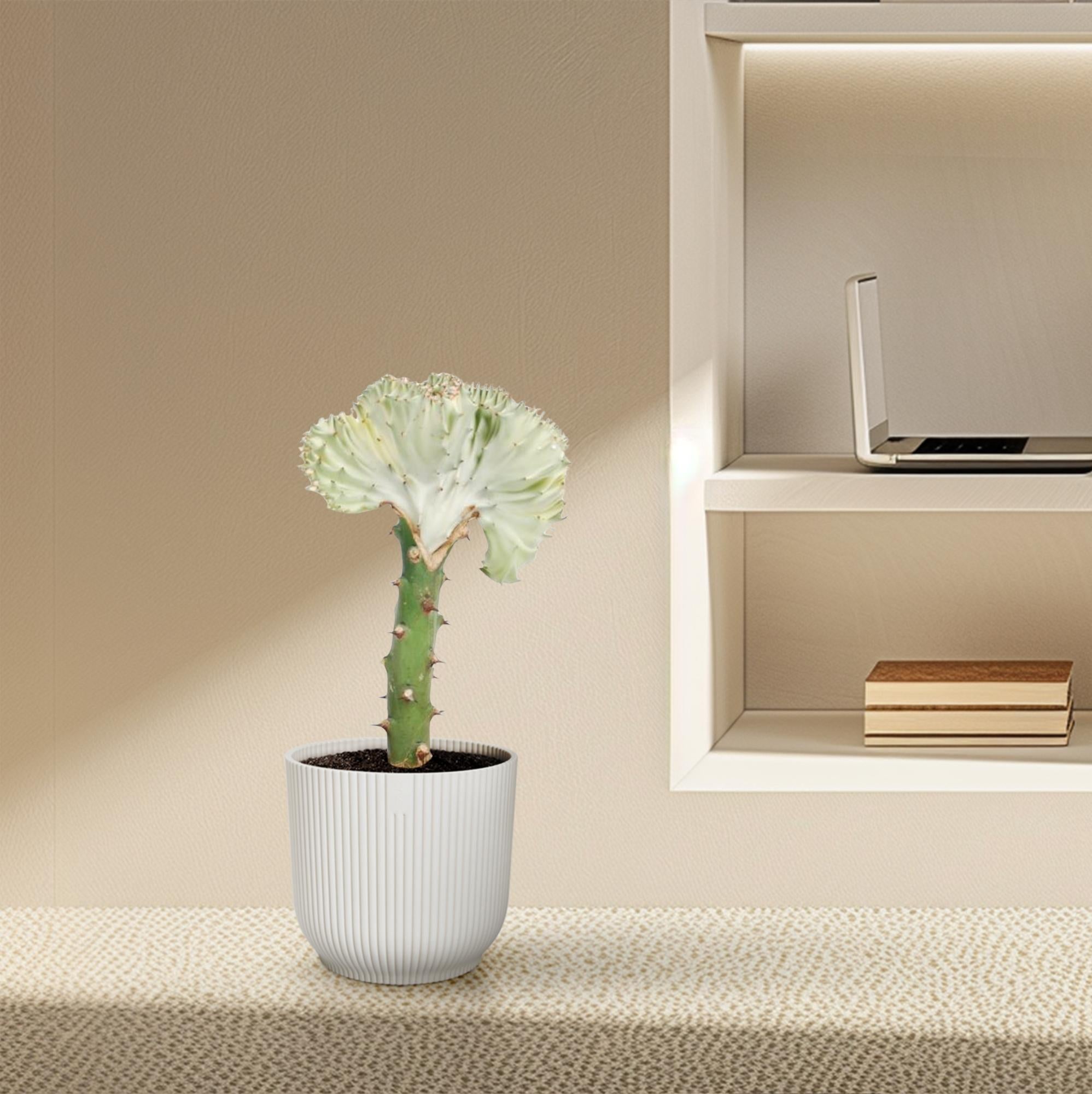 De Euphorbia lactea Cristata is een bijzondere gecresteerde vorm van de Euphorbia lactea, oorspronkelijk afkomstig uit tropisch Azië en India. Deze zeldzame mutatie ontstaat spontaan in de natuur en wordt door kwekers geënt op een sterke onderstam. De spectaculaire witte kleur en golvende vorm maken elke plant uniek.