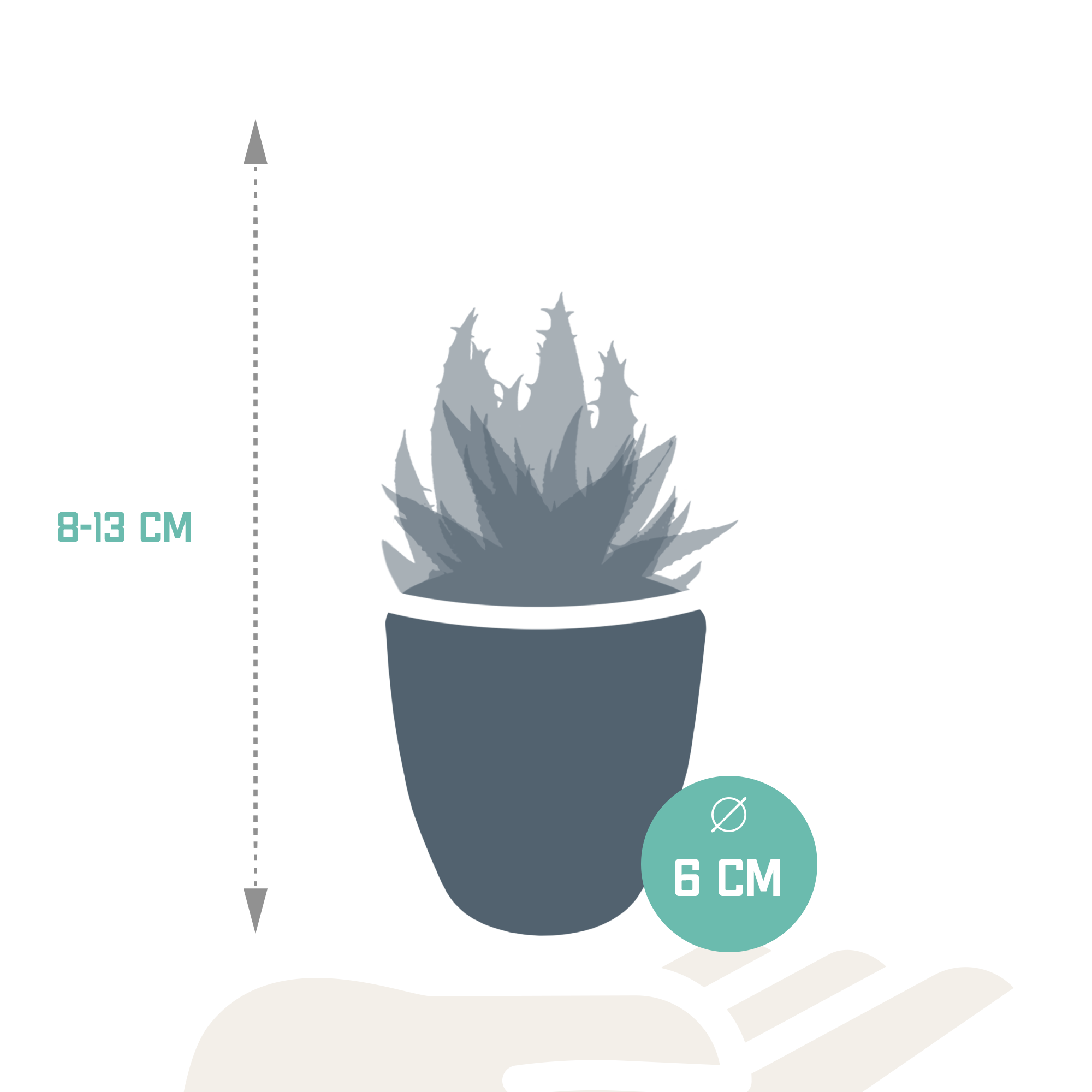 Kenmerkt zich door dikke, vlezige bladeren met diverse patronen, vlekken en strepen. De compacte rozetten variëren van donkergroen tot lichtgroen met witte tekeningen. Set van 5 planten (5,5 cm) in stijlvolle witte pot. Perfect voor vensterbank, bureau of arrangement. Past in elk modern interieur. Zeer onderhoudsvriendelijk en decoratief.