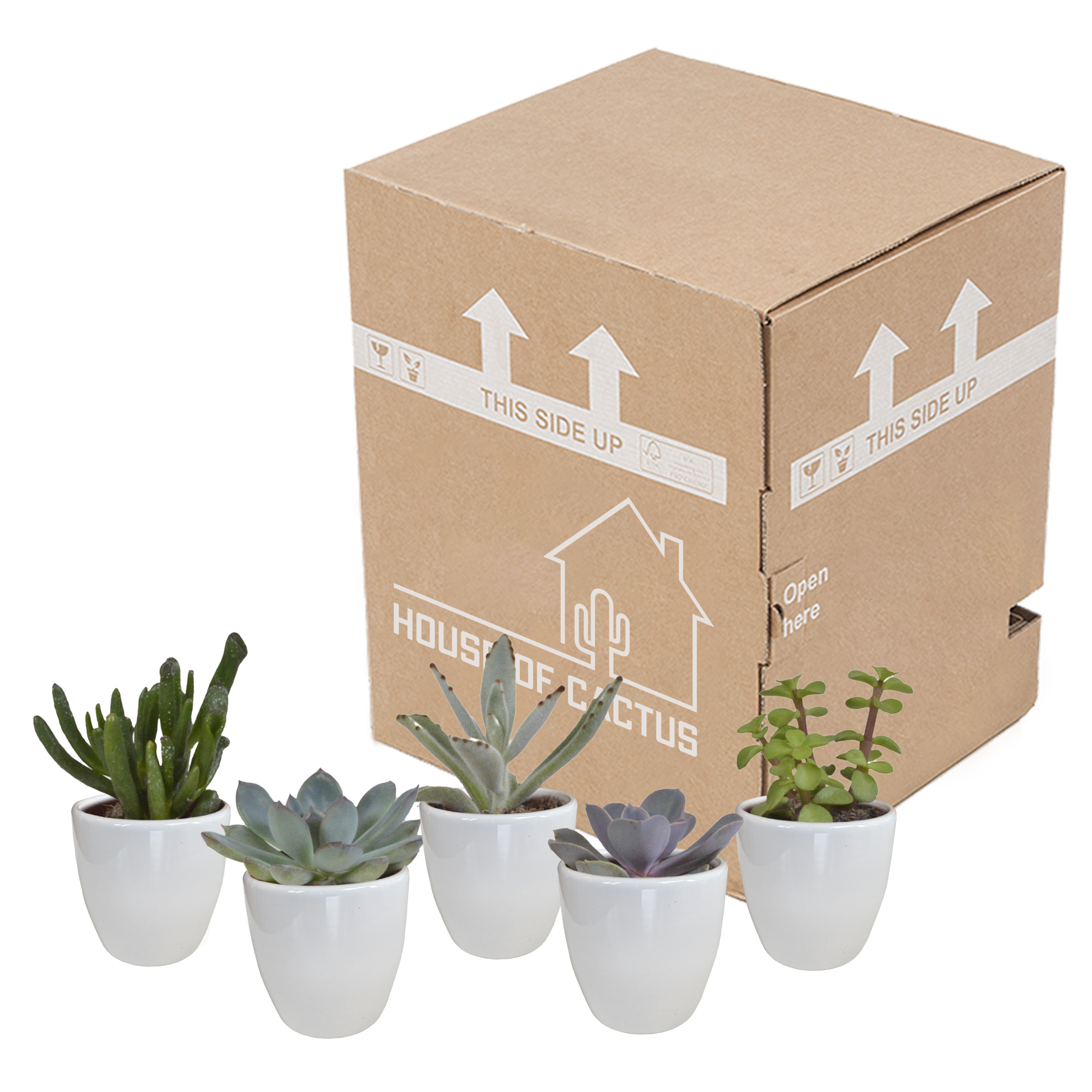 Deze gevarieerde mix van 5 parels biedt een speelse combinatie van texturen, kleuren en vormen. De compacte maat (5,5cm) maakt ze ideaal voor bureaus, vensterbanken en plantenrekken. Geleverd in stijlvolle witte potten voor een clean, moderne uitstraling. Decoratief en onderhoudsvriendelijk.